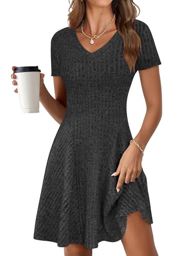 ANRABESS Os vestidos casuais de verão para mulheres apresentam manga curta, decote em V, comprimento do joelho ablove, cor sólida, tecido de malha canelada, lisonjeiro, vestido evasê para modificar bem a forma do seu corpo. Ele fará você parecer elegante e melhor com colares delicados, óculos de sol modernos e outros acessórios.