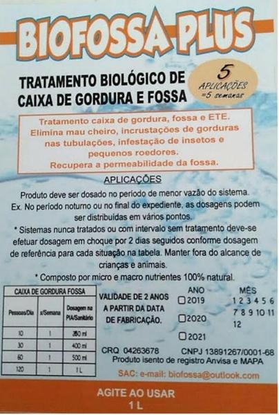 Produto Biofossa Plus tem 5 aplicações, 5 semanas de tratamento. Baixa dosagem. Cada aplicação são 200ml Reduz limpeza mecânica de alto custo. Para Fossa e caixa de gordura residenciais são necessários 200mL de produto uma vez por semana - 1 mês de Tratamento nesta embalagem 100% Natural e não agride o Meio Ambiente Evita Mau Cheiro, Proliferação de insetos e pequenos roedores. Produto é composto por micro/macro nutrientes e enzimas. Reduz gordura das paredes e tubulações do sistema. Aumenta eficiência de ETEs e Reduz a DBO e DQO. Caixa de gordura e Fossas que nunca utilizaram ou cessaram o uso do produto devem dosar produto em choque. ETE e Lagoas as dosagens devem ser consultadas. Neste anuncio o valor total é para embalagem de 1 litro, mas fornecemos embalagens maiores. Produto pode ser usado em restaurantes, Hotéis, casas, indústrias, etc... Compostagem: Deve-se utilizar 2 Litros para cada 1 Tonelada de material da compostagem Durante o tratamento evitar o descarte de desinfetantes concentrados diretamente no sistema. Os pontos de aplicação são, caixa de gordura, fossa, ralo, pia e vaso sanitário, nesse ultimo será necessário acionar a descarga após a aplicação. Cada aplicação poderá ser diluida em um litro de água. Para diminuir odores desagradáveis, iniciar com duas aplicações semanais e assim que diminuir passar para uma aplicação semanal.