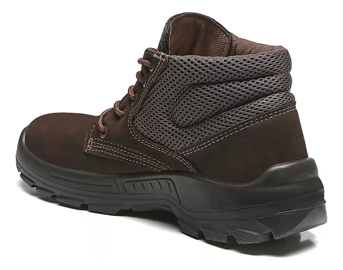 Botina de proteção de amarrar, caixa individual, cano acolchoado, confeccionada em nobuck marrom cafe, com forração interna da gáspea em não tecido e forro do cano em tecido com alto poder de absorção de suor, biqueira plástica conformada, palmilha de montagem em não tecido e sobrepalmilha de eva 4mm e solado de poliuretano (pu) bidensidade, constituído por duas camadas injetado diretamente ao cabedal.