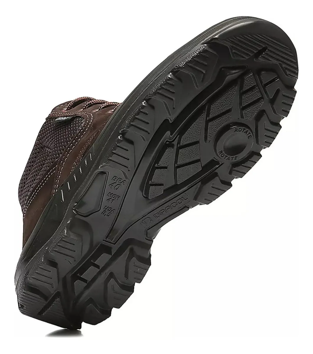 Solado bidensidade constituído de duas camadas de PU injetado diretamente ao cabedal, sendo a entressola mais macia proporcionando maior conforto e compacta de maior densidade ótima resistência à abrasão e desgaste.