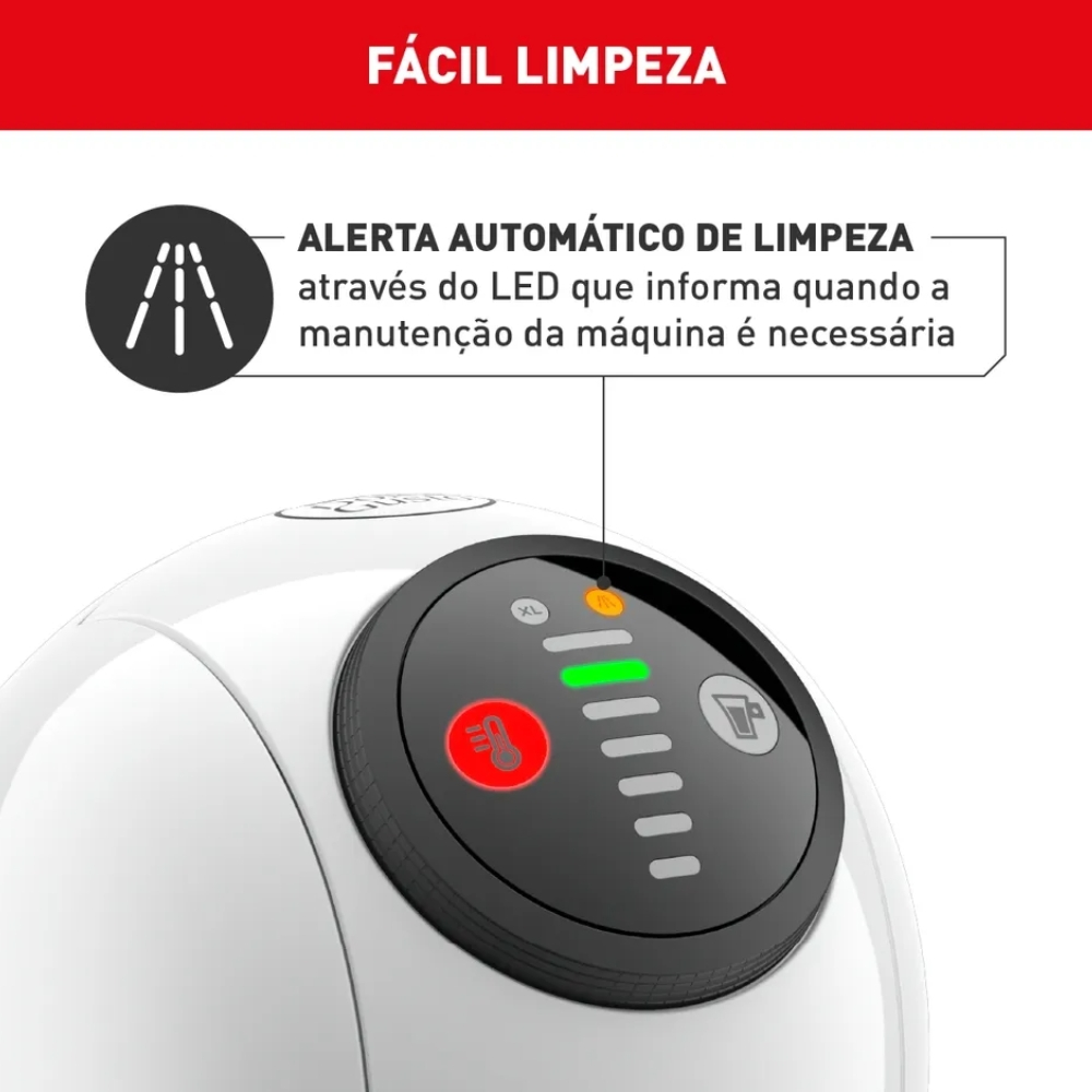 Alerta automático por LED indicando a necessidade de limpeza interna de resíduos de café, leite ou chocolate.
