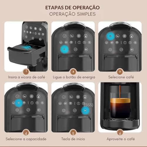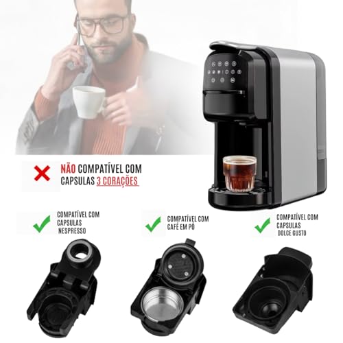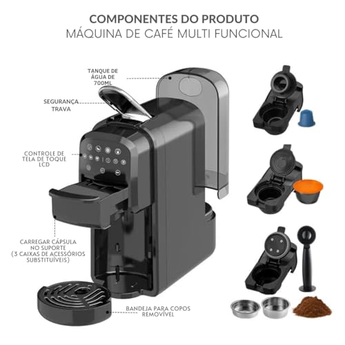 Design Moderno Premium com acabamento em aço escovado e detalhes em preto fosco Compatibilidade 3 em 1: Aceita cápsulas e café moído Painel Touch Inteligente com modos de preparo programados Reservatório de Água Ampliado: 700ml, ideal para múltiplos cafés Bomba de Alta Pressão para extração profissional de espresso Função de Limpeza Automática para praticidade e durabilidade Economia de Energia com desligamento automático após 15 minutos