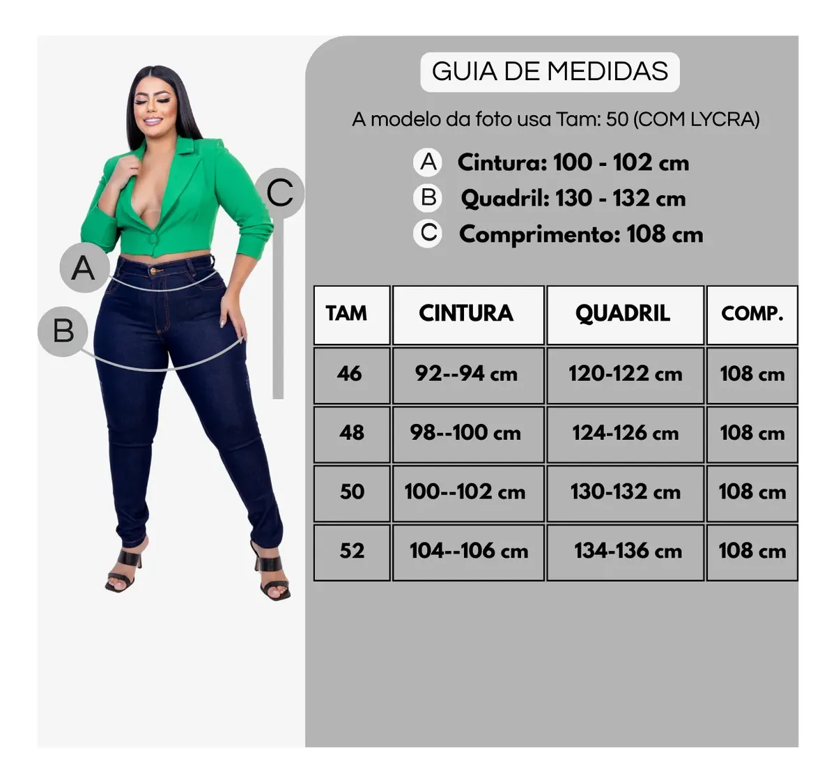 R- Sempre temos duas tabelas de medidas no anúncio, uma no carrossel de imagens e outra na descrição do produto.