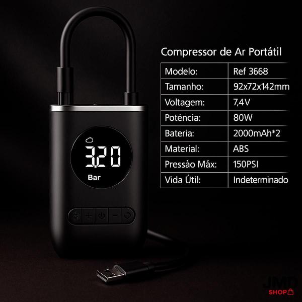 Pode ser utolizado em PNEU DE CARRO, BICICLETA, MOTO, ENCHER BOLAS e ainda acompanham vários bocais diferentes. Possui bateria interna de 2000mah Recarregável, com visor Digital da Pressão e Nível da Carga da Bateria.