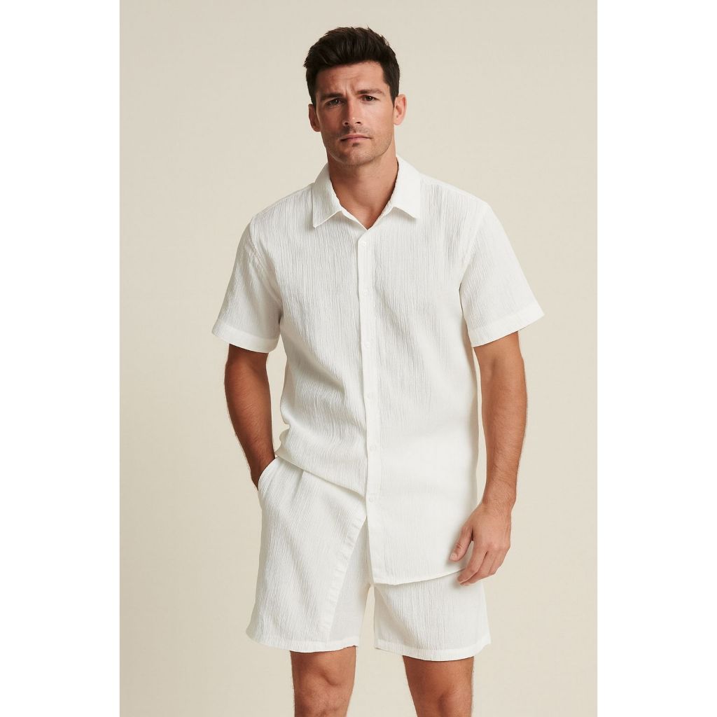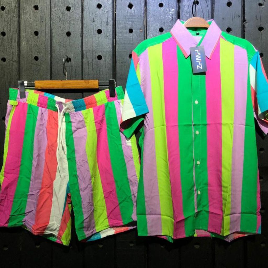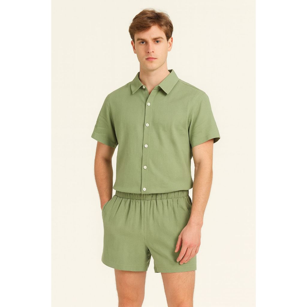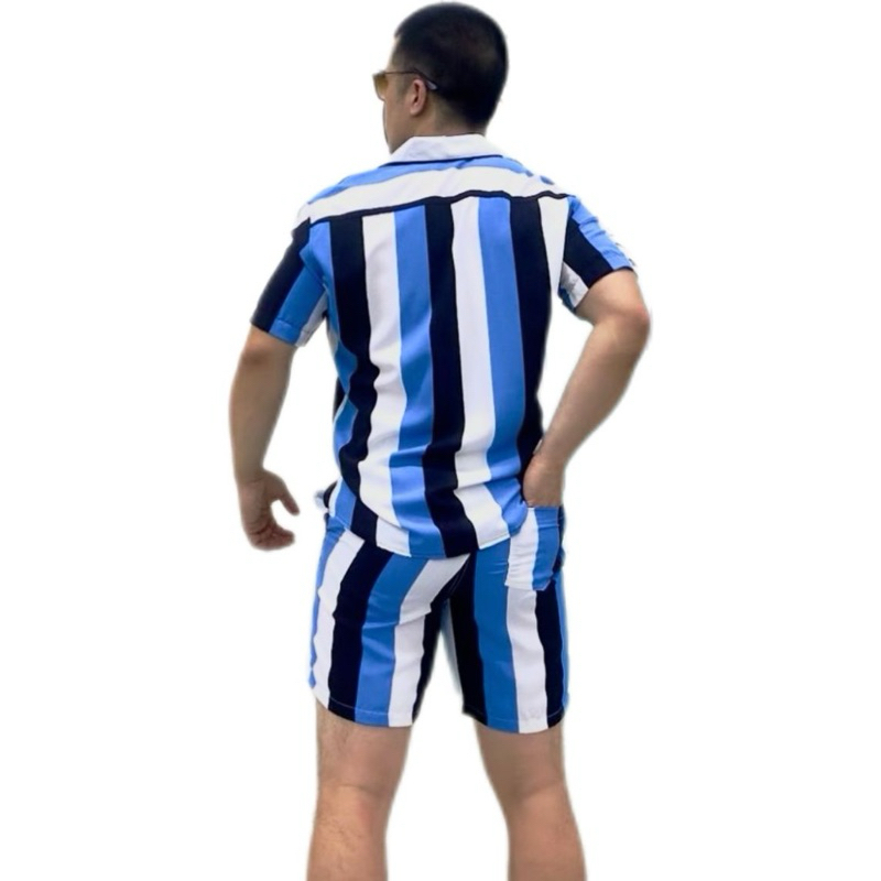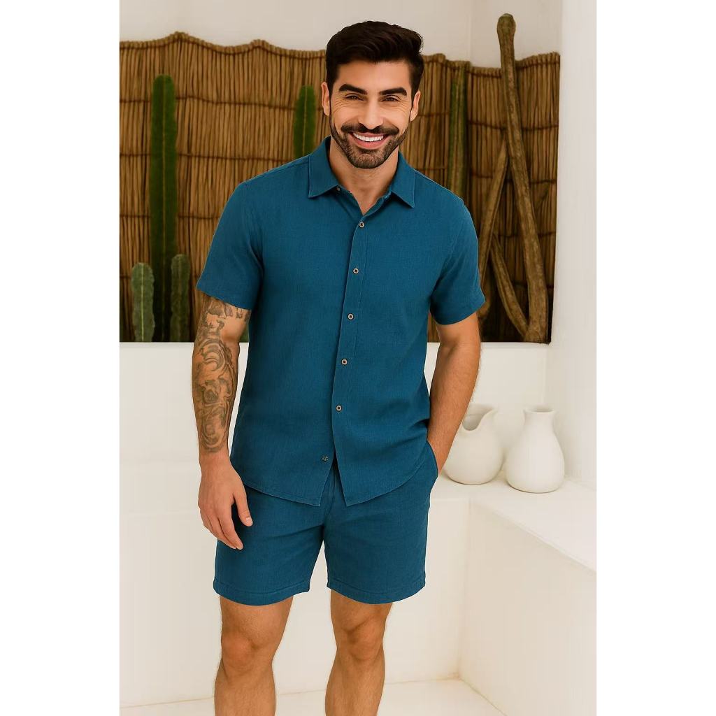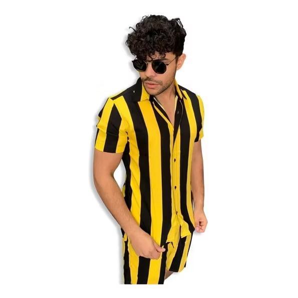 Camisa Conjuntos listrada e lisa masculina slim fite Manga curta férias na praia viscolinho