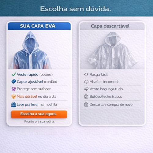 Capa de Chuva EVA Transparente Unissex Adulto com Capuz Ajustável, Impermeável Reutilizável, Fechamento por Botões (Poncho)