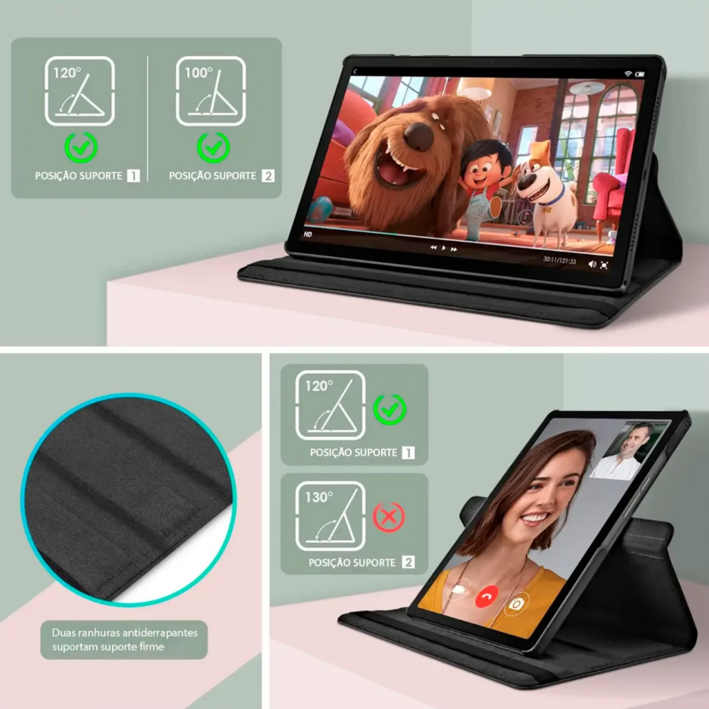 Possui base giratória que permite usar o tablet tanto na posição vertical quanto horizontal, ideal para assistir filmes, estudar, trabalhar, ler ou participar de videochamadas.