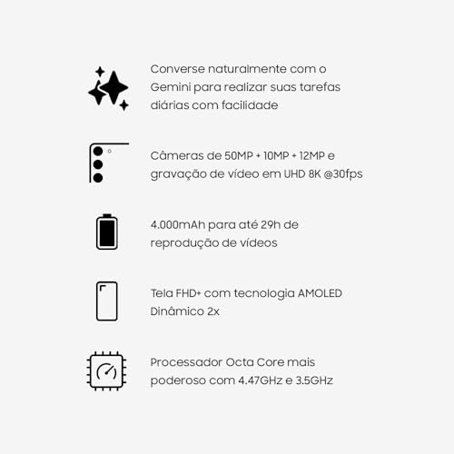 A Samsung apresenta o mais novo lançamento da linha S. Seu verdadeiro aliado AI, o Galaxy S25 é o novo celular com o poder da nova geração da inteligência artificial. Tenha em suas mãos uma nova experiência com Galaxy AI com seus novos recursos. Eleve o seu dia a dia, com assistência rápida e completa com os novos recursos de IA mais avançados, como traduções em tempo real, geração de texto e imagens, tudo isso com maior rapidez e privacidade, graças à execução de tarefas diretamente no dispositivo. Novas formas de realizar suas tarefas, se divertir, criar e cuidar da sua saúde. Um celular AI totalmente novo que auxilia sua vida diária com conversas em linguagem natural. Celular AI semelhante ao humano alimentado por agentes de IA e com diversos recursos ao seu alcance, com o Gemini Live, conclua instantaneamente várias tarefas de uma só vez com uma conversa natural tendo uma ação entre aplicativos. Conclua várias ações de uma só vez, falando naturalmente com a série Galaxy S25, que entende seus comandos de voz. Sincronize suas mensagens, calendários, texto apenas ativando um único comando. Obtenha facilmente informações, ações e soluções de que você precisa com base no contexto da sua tela. Encontre intuitivamente as informações de que você precisa com pesquisa na tela ou circule para pesquisar. A nova função Now Bar & Now Brief, ainda permite que você verifique as notificações para tarefas em andamento e receba um resumo diário de suas atividades. O Gravador de chamada é mais uma novidade no Galaxy S25, permite que você faça gravação de chamadas com transcrição e resumo no dispositivo. O Novo Galaxy S25 ainda conta com o processador mais poderoso da linha S. O Snapdragon 8 Elite for Galaxy (3nm) tem seu desempenho aprimorado de forma abrangente, oferecendo uma experiência móvel poderosa. O processamento de IA mais rápido em um Galaxy, fornecendo resultados de IA mais confiáveis do que nunca. Falando de câmera o novo Galaxy S25, permite que você tenha novas experiências de filmar e fotografar surpreendente com detalhes e cores mais vibrantes. Tenha o maior nível de detalhes em suas fotos e vídeos, independentemente da lente que você estiver usando. Vídeos Nightography destacam inúmeros detalhes. Imagens vibrantes e realistas, Reconhecimento perfeito do tom de pele com o Object-Aware Engine. O Assistente de fotografia dentro do novo Galaxy S25 ainda conta com novas funcionalidades. O eliminador de áudio ajuda a remover ruídos indesejados em seus vídeos e a uma nova função para você reproduzir a magia do cinema no Studio combinando fotos e vídeos da galeria em novos projetos de filmes. A linha Galaxy S25 ainda conta com a sua identidade de design única da série S, ultra elegante, molduras mais finas e uniformes para visualização mais ampla e usabilidade mais confortável. Sua durabilidade excepcional possui materiais meticulosamente selecionados para um design premium e durável. Seu acabamento em alumínio forte com dureza incrível para o S25 e S25+. E para a versão Ultra acabamento em Titânio. O metal mais resistente já usado na série Galaxy. Vidro resistente “Corning Gorilla Armor” para maior durabilidade (Resistência a arranhões e choques). Brilho adaptável garantindo uma visualização suave e confortável. O novo Galaxy ainda conta com um mix de Cores luminosas inspiradas na natureza, sendo elas: Azul, Verde, Prata e Azul Marinho para a versão básica e Plus. Já nas versões do modelo Ultra, as cores são Titânio Preto, Titânio Cinza, Titânio Prata, Titânio Azul. Com o aplicativo Smart Switch você transfere de forma fácil e prática o conteúdo do seu celular anterior (fotos, contatos, eventos do calendário, notas, configurações do dispositivo e muito mais) para o novo Galaxy S25. Para sua melhor segurança não deixe de conferir as ativações do Cadeado Galaxy, tenha seus dados e seu celular seguro e protegido. *Acesse: www.cadeadogalaxy.com.br