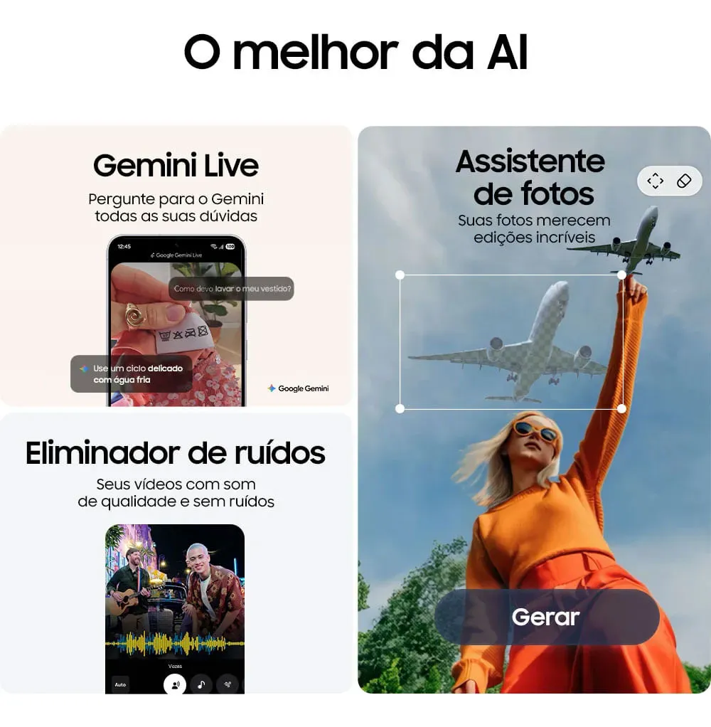O Galaxy S25 FE chega com recursos de câmeras, performance, inteligência artificial e design em uma combinação perfeita. Com sua câmera tripla traseira, lente principal de 50MP e câmera frontal de 12MP com HDR, o Galaxy S25 FE permite que você tenha novas maneiras de criar, retratos surpreendentes, selfies aprimoradas e edições de vídeo com IA (ProVisual Engine). O poderoso processador Exynos 2400 otimiza hardware e software para aprimorar a usabilidade da IA e toda a performance do Galaxy S25 FE. Para você curte jogos o, Galaxy S25 FE permite que você aprimore sua jogabilidade com visuais envolventes e tenha um desempenho mais potente e estável. Sua tela de Amoled dinâmico FHD+ de 6.7” é grande, brilhante com até 1900 nits garante uma visualização imersiva nos seus vídeos e fotos. E a taxa de atualização de até 120Hz traz mais fluidez para seu conteúdo. O Galaxy S25 FE conta com novas funcionalidades da inteligência artificial, com o Google Gemini integrado em seu sistema operacional. Ele enriquece seu dia a dia com um assistente de IA que é fácil de usar, que entende o que você diz de maneira natural. Basta um simples toque no botão lateral e você acessa o Gemini rapidamente. Com a ação integrada entra aplicativos, o Gemini integra não somente aplicativos Google, mas também os aplicativos nativos do Galaxy e de terceiros para oferecer assistência inteligente no uso do seu dispositivo. O Galaxy S25 FE ainda conta com acabamento reforçado em Corning Gorilla® Glass Victus+, resistência a água e a poeira (IP68) trazendo melhor proteção para o seu dia a dia. E você tem 3 opções de cores para escolher a que mais combina com você: Azul, Azul Marinho e JetBlack. Para uma experiência duradoura e segura com o seu aparelho, O Galaxy S25 FE conta com 7 atualizações de sistema operacional Android e 7 anos de atualizações de segurança. Conta com a proteção aprimorada através do Samsung Knox, garantindo que os dados confidenciais e sigilosos permaneçam seguros. Com o aplicativo Smart Switch você transfere de forma fácil e prática o conteúdo do seu celular anterior (fotos, contatos, eventos do calendário, notas, configurações do dispositivo e muito mais) para o Galaxy S25 FE.
