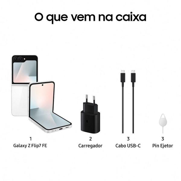 Prepare-se para uma experiência revolucionária com o smartphone Samsung Galaxy Z Flip7 FE na cor branca. Com seu design dobrável icônico, ele redefine a praticidade e a elegância.