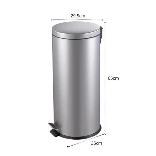 - Abertura da Lixeira PedalAmbiente CozinhaCapacidade 30 LitrosCor Prata-PremiumDimensões do Produto 65cm x 29,5cm x 35cmFormato RoundFuncionalidades da Lixeira Cesto removível, alça traseira, proteção contra marcas de digital, fechamento suave da tampaMarc