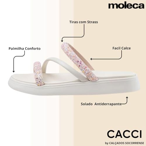 Confeccionada em material sintético, o Chinelo Flatform Moleca conta com tira dupla com aplicação de strass e 1 em camurça no peito do pé.