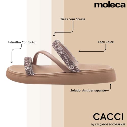 Confeccionada em material sintético, o Chinelo Flatform Moleca conta com tira dupla com aplicação de strass e 1 em camurça no peito do pé.