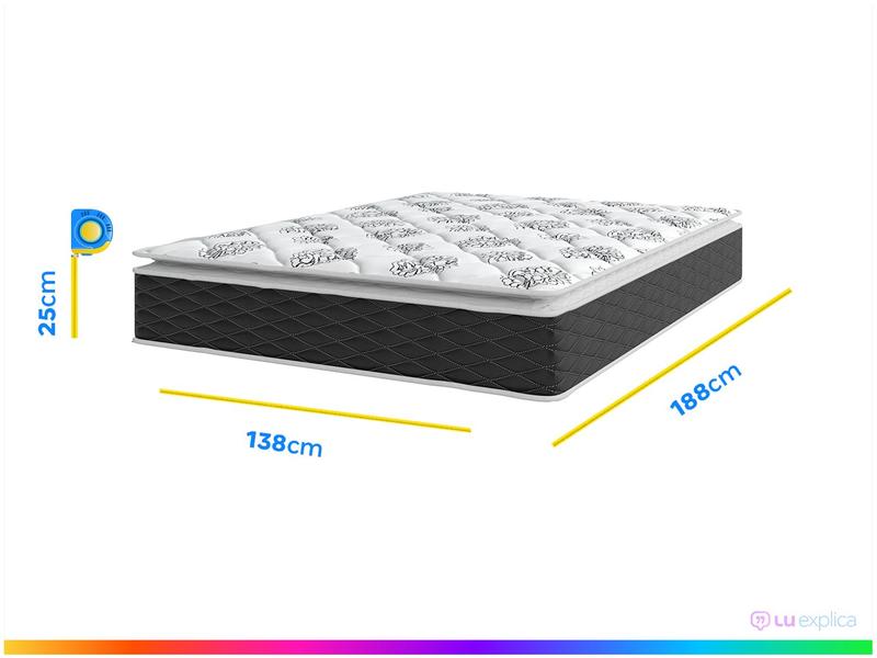 Durma tranquilamente e tenha um descanso necessário para ser produtivo no dia seguinte com o Colchão de Casal Duomo da Umaflex. Possui molas ensacadas individualmente e pré-comprimidas, fabricadas com fio de aço de alto teor de carbono. Por trabalharem independentemente e terem mais molas por m², elas comprimem de acordo com a pressão exercida pelo corpo, proporcionando uma firmeza anatômica perfeita. Além disso, aumenta a resistência do produto e dá maior durabilidade no molejo. Conta também com um pillow top, trazendo a maciez, suavidade e conforto necessário que o corpo precisa. Com densidade D26, suporta até 120kg por pessoa e é ideal para cama box. Suas medidas são 138x25x188cm.