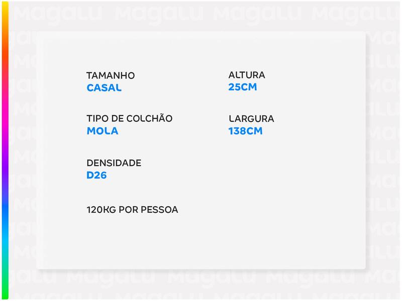 - Largura: 138cm, Altura: 25cm, Profundidade: 188cm