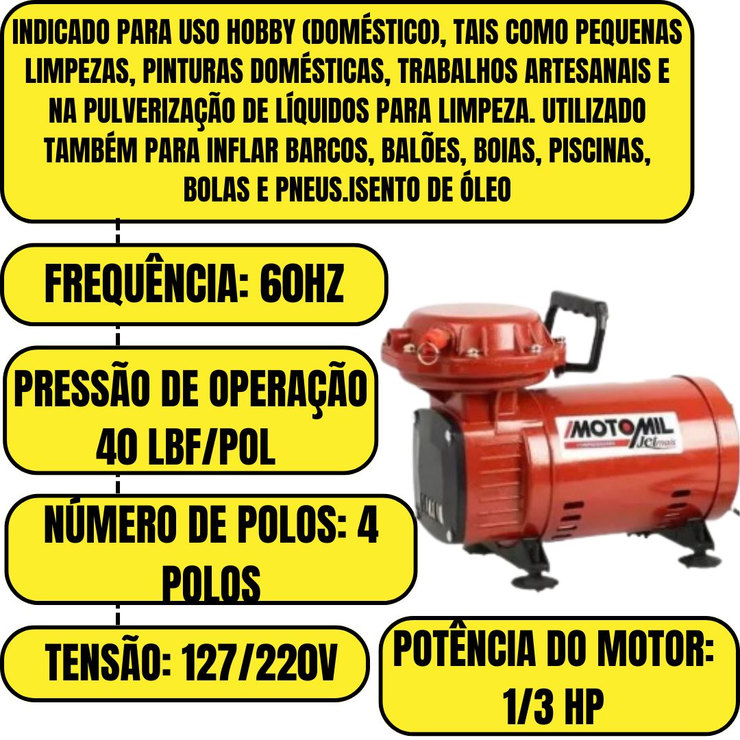 MOTOCOMPRESSOR AR BP 2,3PCM BIV AR DIRETO MOTOMIL JETMAISDESCRIÇÃO DO PRODUTOIndicado para uso hobby (doméstico), tais como pequenas limpezas, pinturas domésticas, trabalhos artesanais e na pulverização de líquidos para limpeza. Utilizado também para inflar barcos, balões, boias, piscinas, bolas e pneus.Isento de óleoCARACTERÍSTICAS- Modelo: Jetmil- Cabo elétrico com plugue- Interruptor liga/desliga- Alça para Transporte- Pés com borracha- Protetor térmicoDADOS TÉCNICOS- Tensão: 127/220V (Bivolt)- Número de fases: Monofásico- Frequência: 60 Hz- Potência do motor: 1/3 HP- Deslocamento Teórico: 2,3 pés/min 65 l/min- Número de polos: 4 polos- Pressão de operação (Máxima): 40 lbf/pol - 2,8 barITENS INCLUSOS- 1 Pistola de pintura- 1 Compressor de ar Jetmil- 1 Mangueira espiral 5 metros com engate rápido.