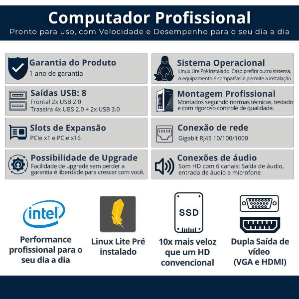 Equipado com processador Intel, reconhecido mundialmente por sua estabilidade e eficiência, esse computador oferece excelente desempenho para uso diário, multitarefas e aplicações profissionais. Você verá as especificações completas do processador mais abaixo na descrição.