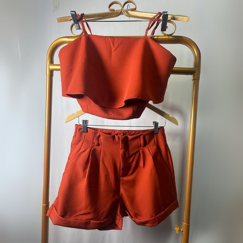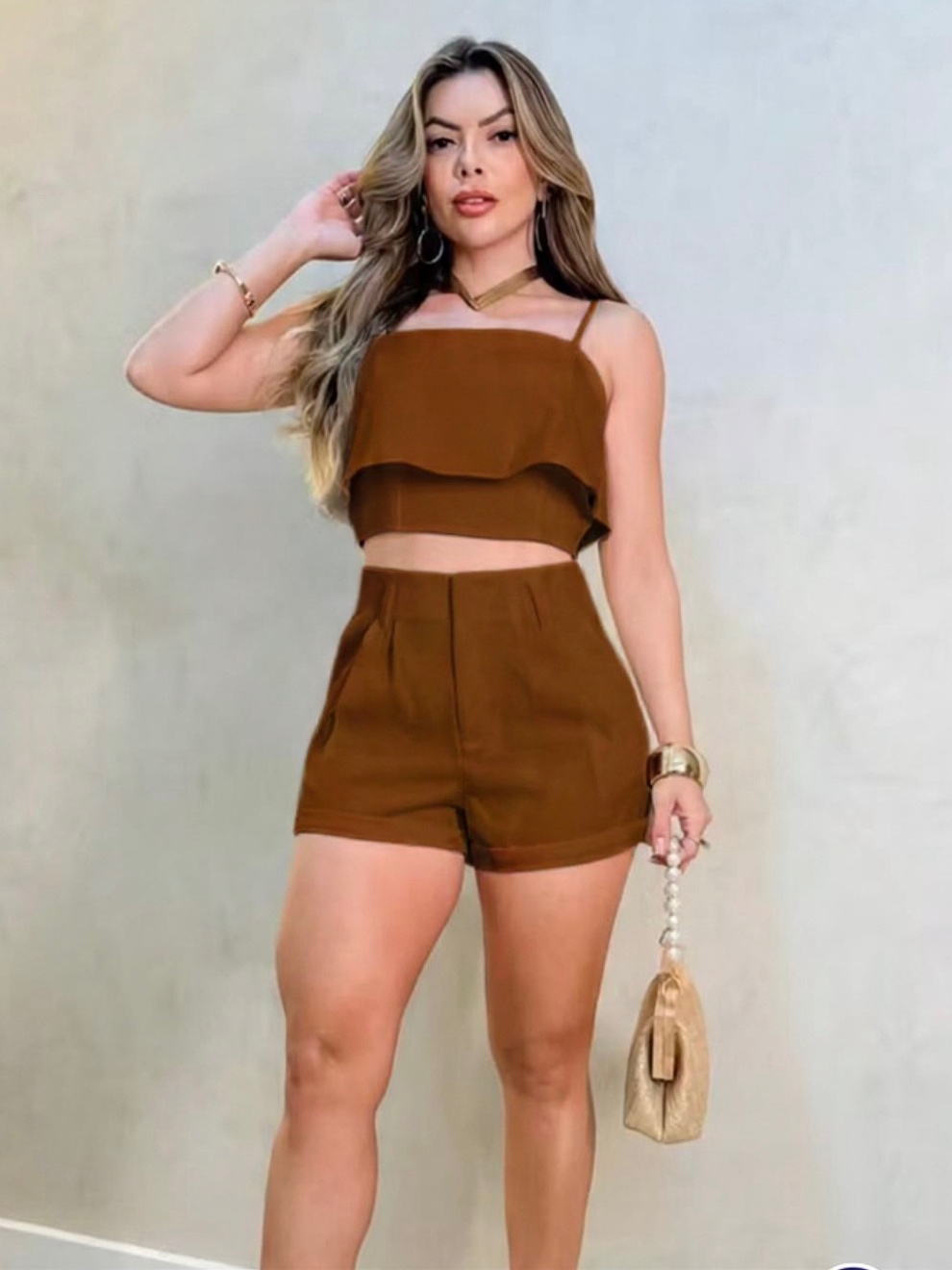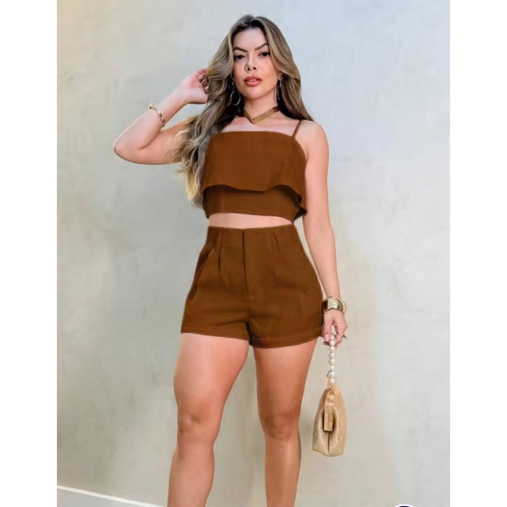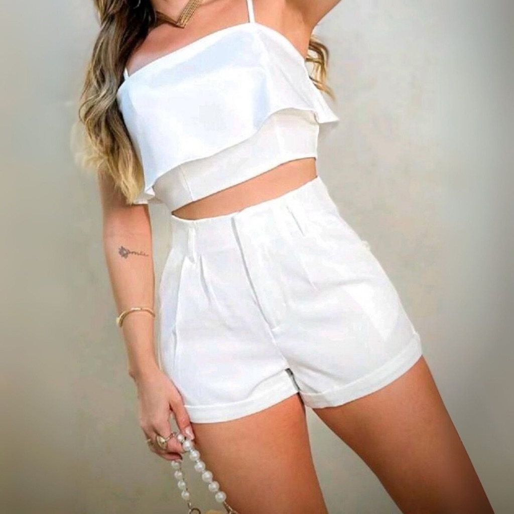 Conjunto Cropped Babado, Alça Regulável e Short, Bolso em Tecido Alfaiataria - Disponível em Diversas Cores e Tamanhos