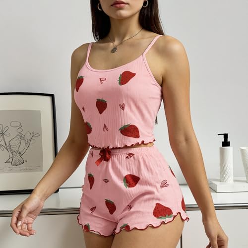 Lindo pijama feminino com estampa de morango, conjunto de 2 peças