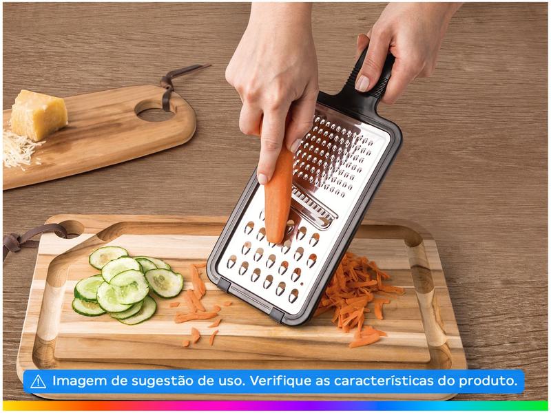 - Utensílios com lâmina de aço inox que proporcionam resistência durante o uso. Cabos com furo passante possibilitando que sejam pendurados na sua cozinha. Ralador com lâmina de aço inox com três diferentes opções de corte. Lâmina com dentes em escala maior