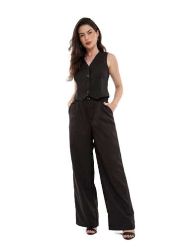 Este elegante conjunto feminino é a escolha perfeita para mulheres que valorizam estilo e conforto. Composto por um colete sofisticado com botões e uma calça comprida em alfaiataria, o conjunto é confeccionado em poliéster com elastano, garantindo caimento impecável e liberdade de movimento. O colete sem bojo oferece um visual leve e contemporâneo, enquanto a calça complementa perfeitamente o look. Disponível nos tamanhos P, M, G e GG, este conjunto versátil na cor preta pode ser usado tanto em ocasiões sociais quanto em ambientes mais casuais. A ausência de forro proporciona maior conforto para uso durante todo o dia, e a modelagem em alfaiataria adiciona um toque de refinamento ao visual. A combinação perfeita de sofisticação e praticidade, ideal para mulheres que buscam peças versáteis e atemporais para seu guarda-roupa.