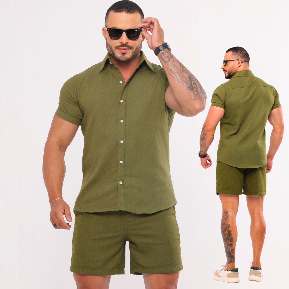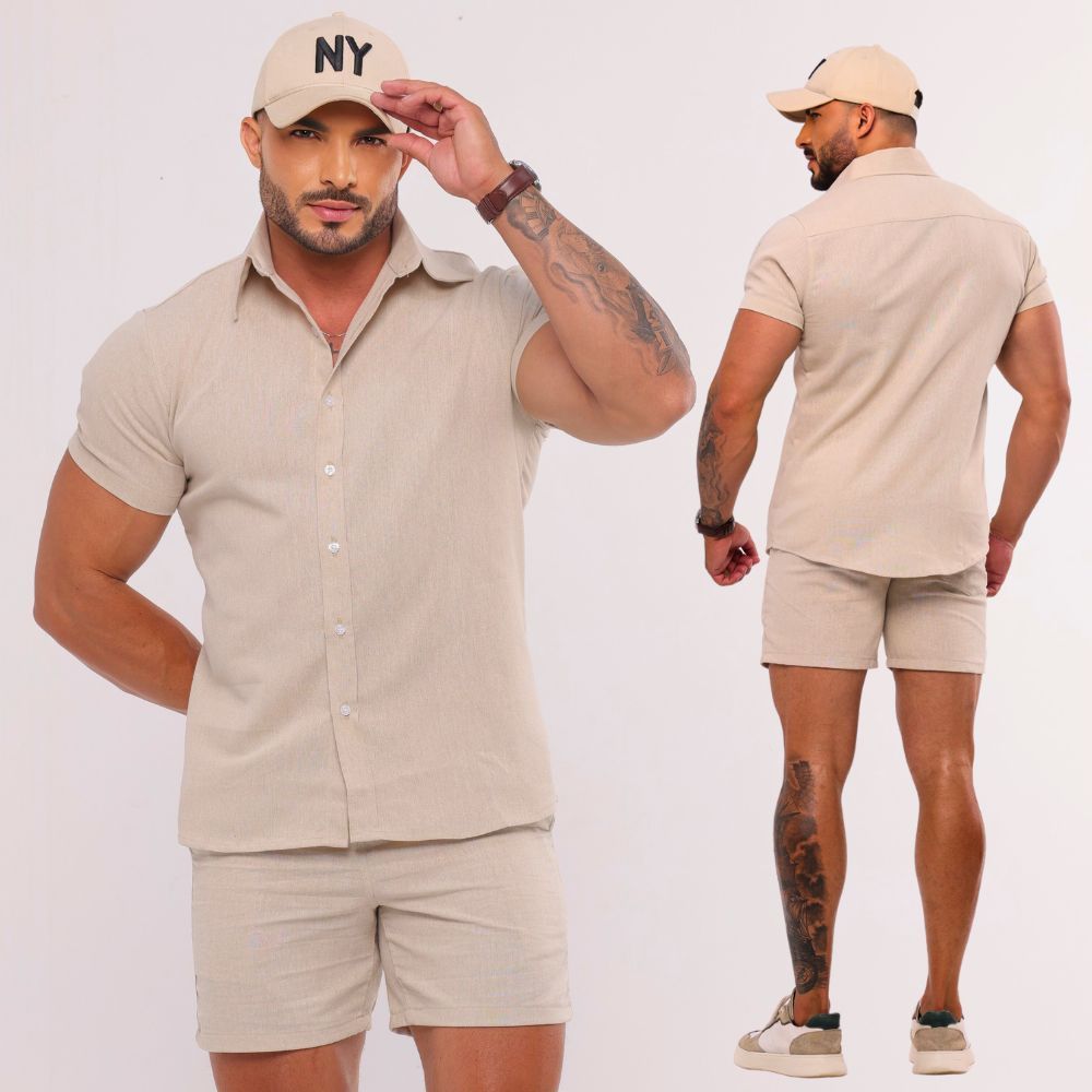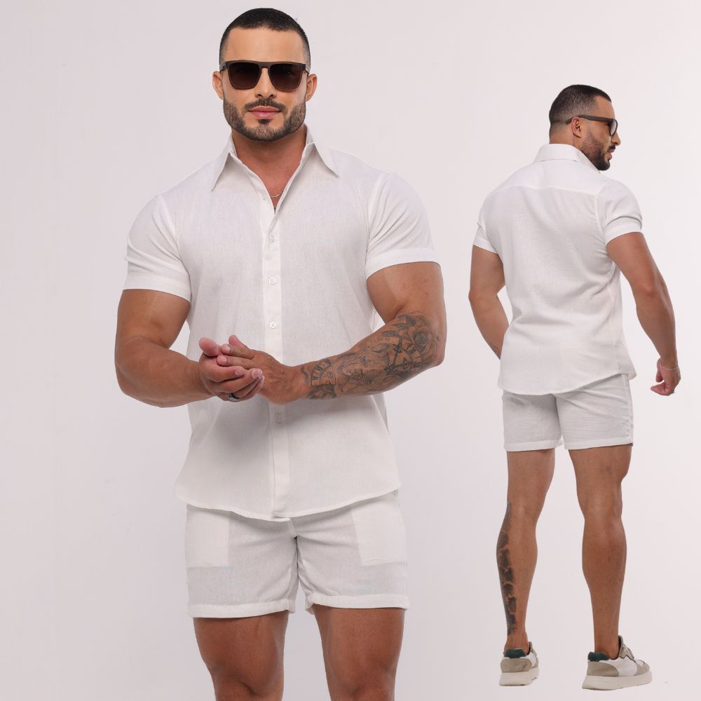 Conjunto Linho Masculino Camisa Botão Bermuda Mauricinho Casual Slim Fit