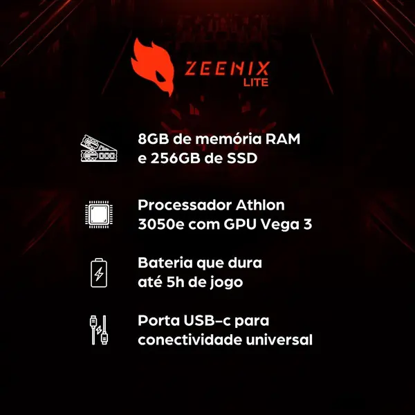 Armazenamento - O Zeenix Lite é equipado com um SSD NVMe super rápido de 256 GB, oferecendo espaço e velocidade ideais para seus jogos. Além disso, o armazenamento pode ser facilmente expandido com um cartão microSD, proporcionando ainda mais flexibilidade e capacidade para sua biblioteca de jogos.