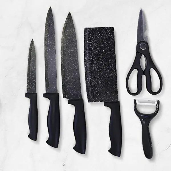 Quer dar vida pra aquela cozinha pálida e sem graça? Que tal começa com um jogo de facas maravilhoso e de alta qualidade? Jogo de facas em Aço Inoxidável com tratamento antiferrugem e revestimento Preto. Cabos fabricados em polipropileno e superficie antiderrapante, propiciam conforto e estabilidade no manuseio das facas.