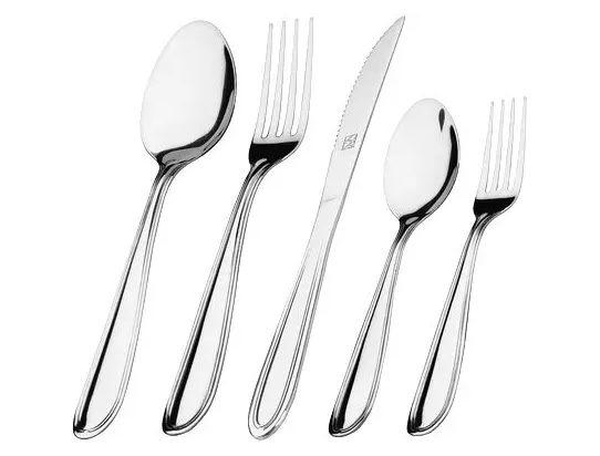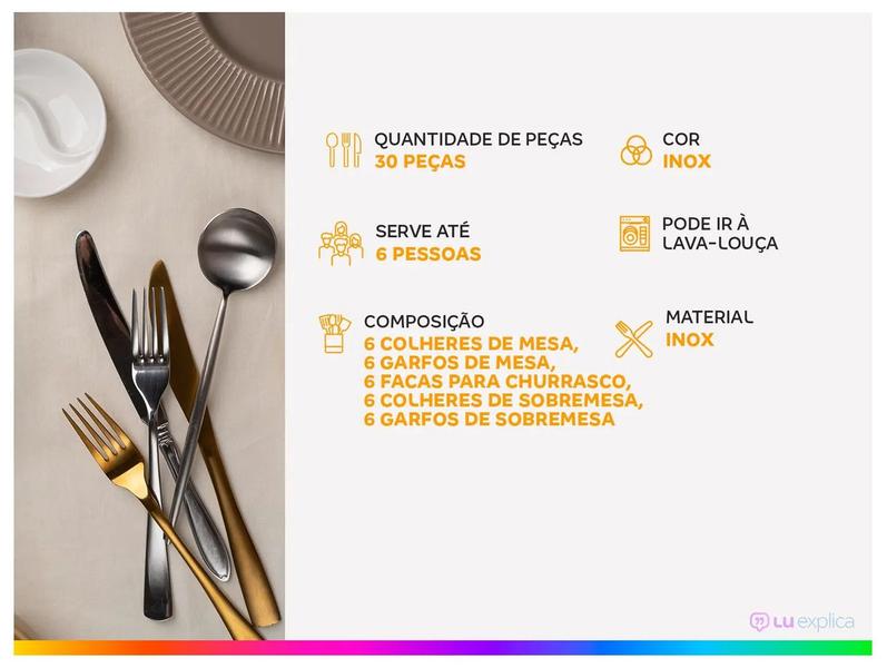 Inclui 6 facas, 6 garfos, 6 colheres de sopa, 6 colheres de sobremesa e 6 garfos de sobremesa, ideal para refeições completas.
