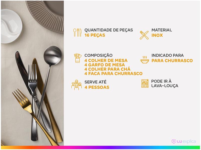 - 4 - Colher de Mesa, 4 - Garfo de Mesa, 4 - Colher para Chá, 4 - Faca para Churrasco