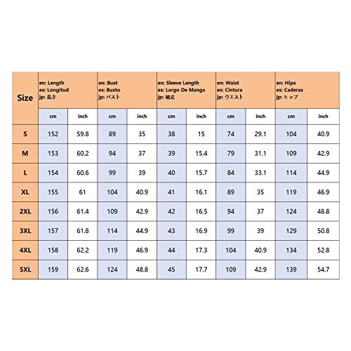 S: Comprimento 152 cm \ 59,8 polegadas || Busto 89 cm \ 35 polegadas || Comprimento da manga 38 cm \ 15 polegadas || Cintura 74 cm \ 29,1 polegadas || Quadris 104 cm \ 40,9 polegadas