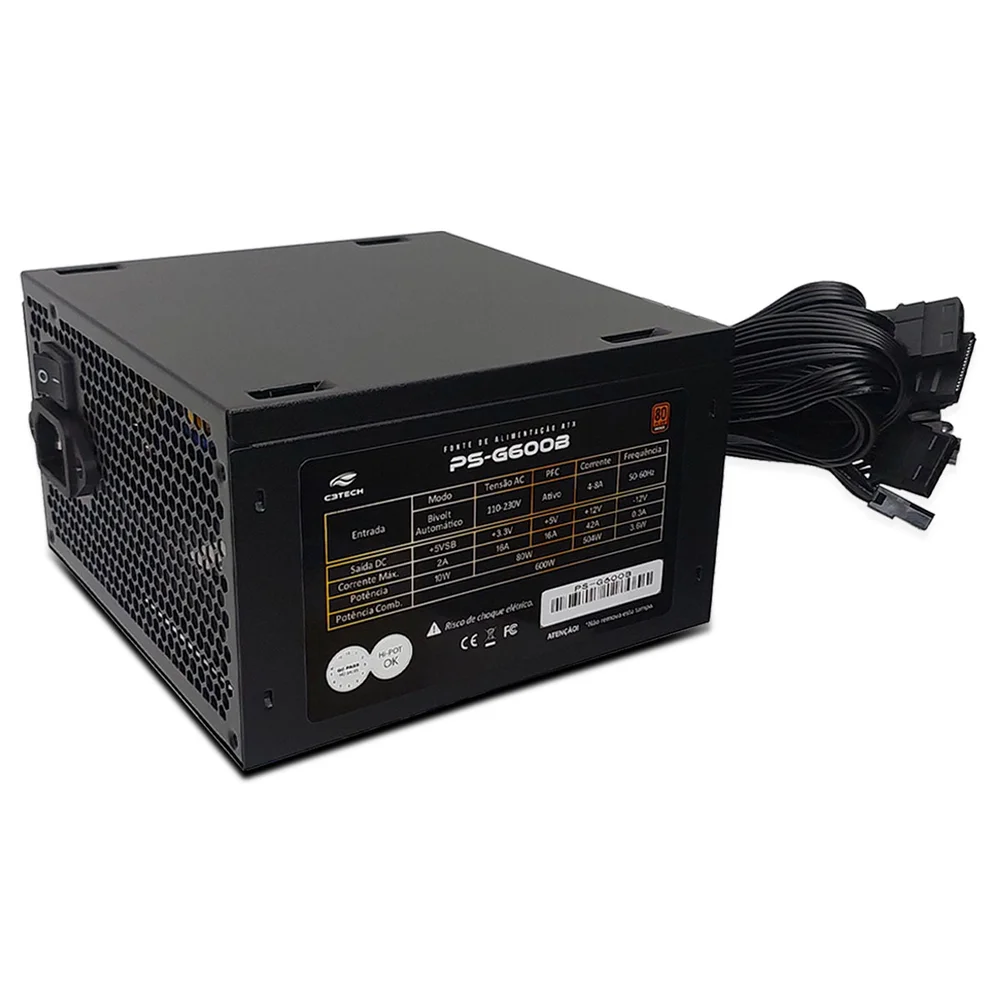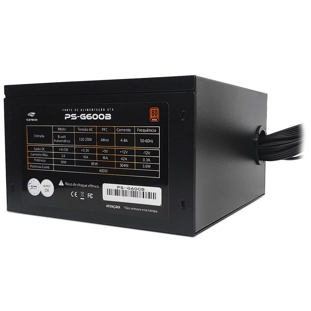 Fonte C3Tech Gamer ATX, 600W, 80 Plus Bronze, PFC Ativo, Bivolt Automático, PS-G600B