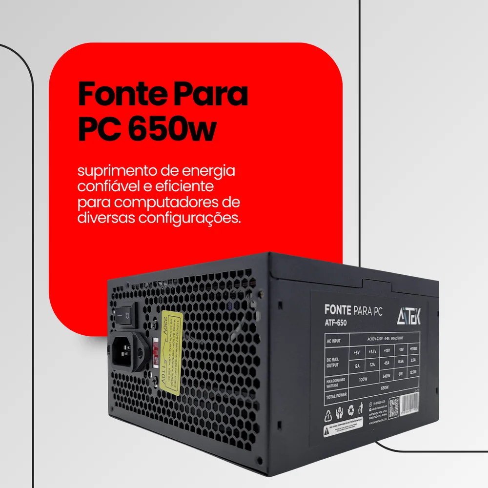 A Fonte Aitek ATF-650 é a escolha ideal para quem busca potência e estabilidade para seu computador. Com 650W reais, oferece alto desempenho e segurança, sendo compatível com sistemas AMD e Intel, garantindo eficiência para PCs de uso diário, trabalho e games.