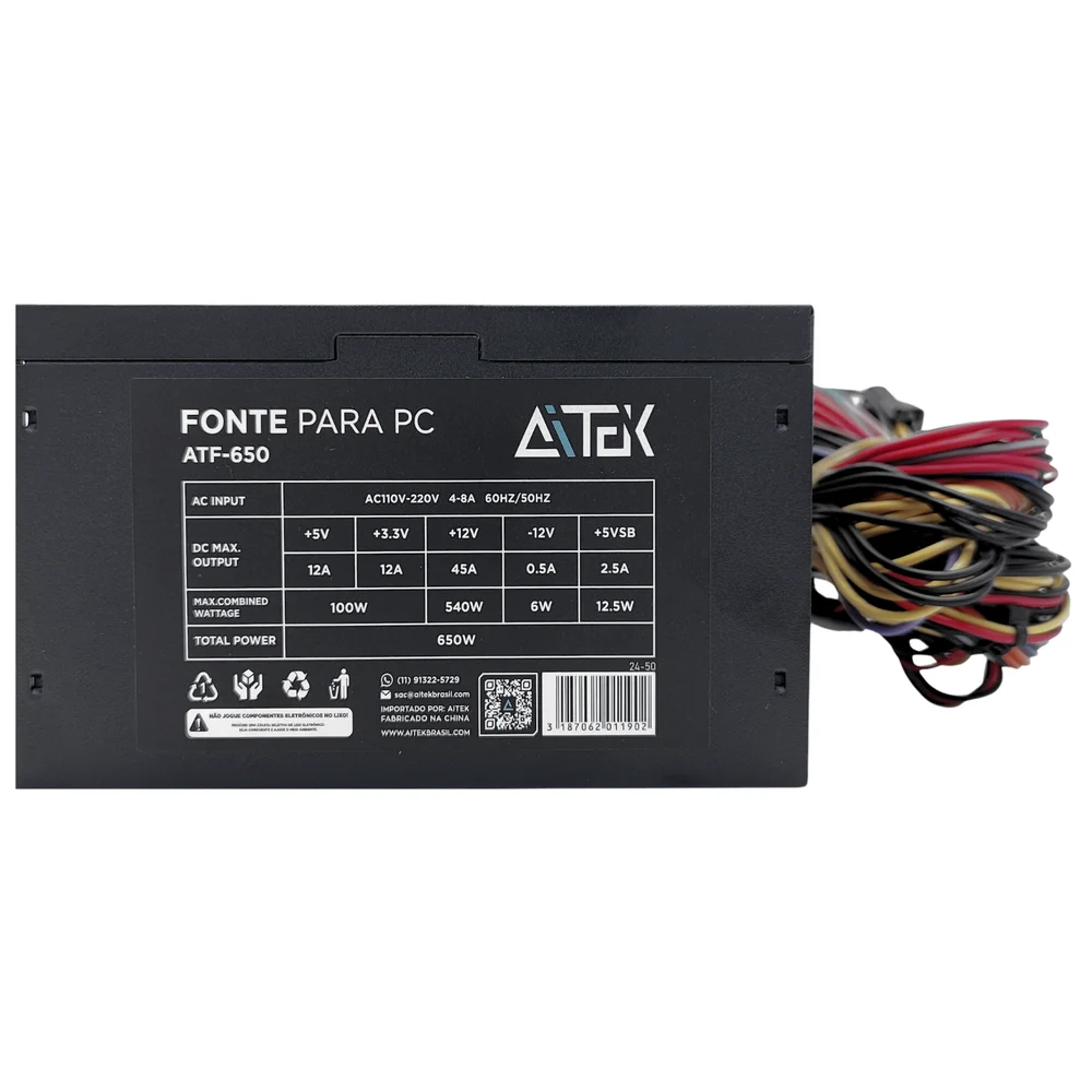 A Fonte Aitek ATF-650 650W oferece energia confiável e eficiente, garantindo o melhor desempenho para seu computador.