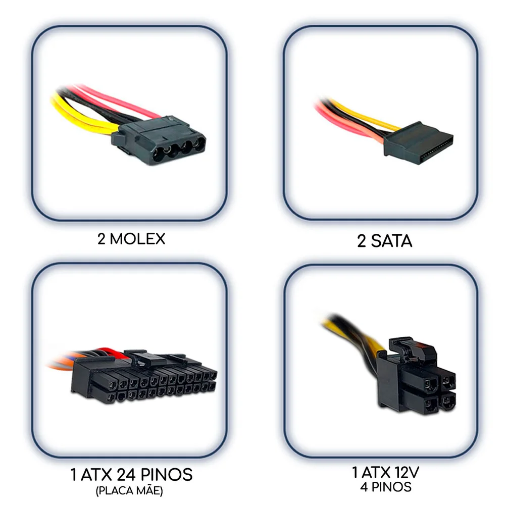 conexões versáteis: oferece uma variedade de conectores para acomodar seus dispositivos, incluindo conectores sata, molex, permitindo que você conecte discos rígidos, unidades de dvd, outros periféricos com facilidade.