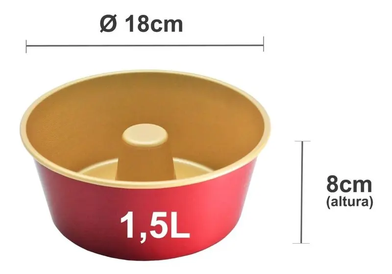- CertificaçõesCERTIFICADO PELO INMETROConteúdo da EmbalagemForma Bolo Pudim Redonda com Tubo Antiaderente 18 diâmetro x 8 altura cmCorCereja E CremeDimensões do Produto18 diâmetro x 8 altura cmFormatoRedonda com TuboFuncionalidades da AssadeiraAntiaderente