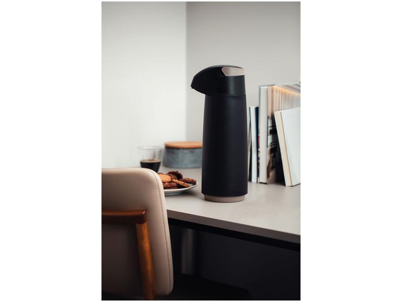 A garrafa térmica é projetada com você em mente. A alça embutida oferece uma pega confortável e uma sensação de estabilidade ao transportá-la. Além disso, o "puxador" intuitivo torna mais fácil abrir a alça, sem complicações.