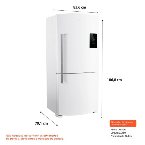 - Capacidade Líquida Total Super Alta - Acima de 550LCapacidade Líquida do Freezer 191Capacidade Líquida do Refrigerador 400Cor BrancoDimensões do Produto altura (cm) [sem embalagem]: 186,8, largura (cm) [sem embalagem]: 83,6, profundidade (cm) [sem embalag