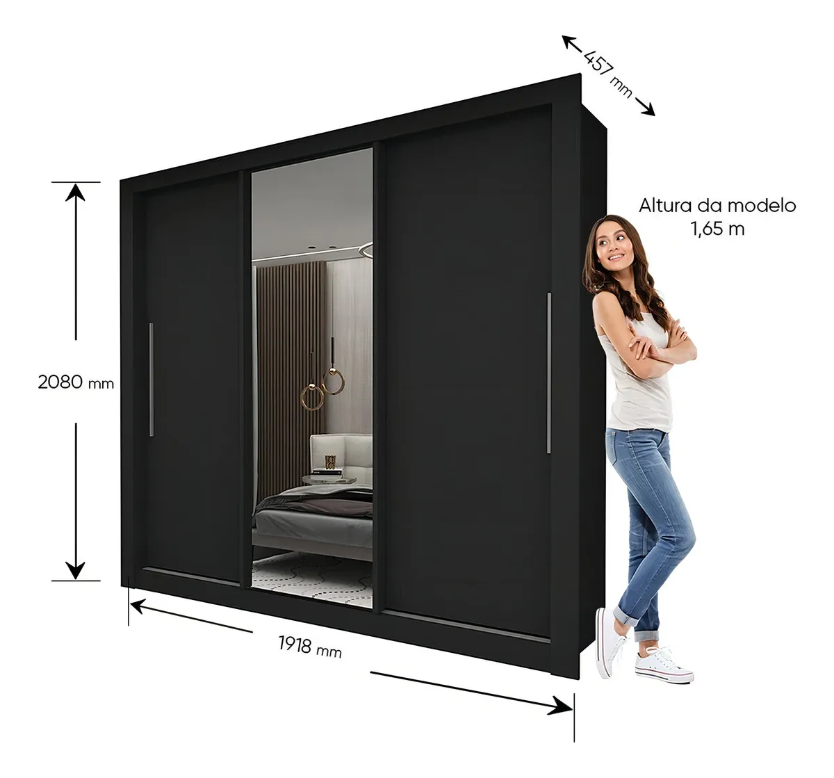Guarda-roupa Casal 3 Portas Preto com Espelho Milão Yescasa MDF