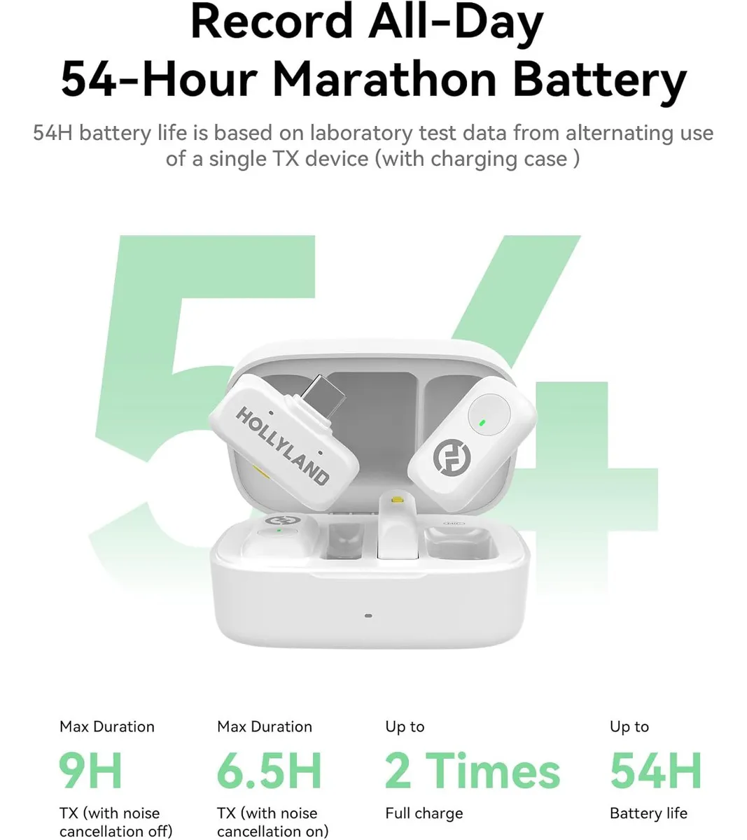 -Até 54 horas de duração da bateria: obtenha até 54 horas usando um transmissor (TX) alternadamente com o estojo de carregamento, ideal para longos dias de gravação sem se preocupar com a bateria.