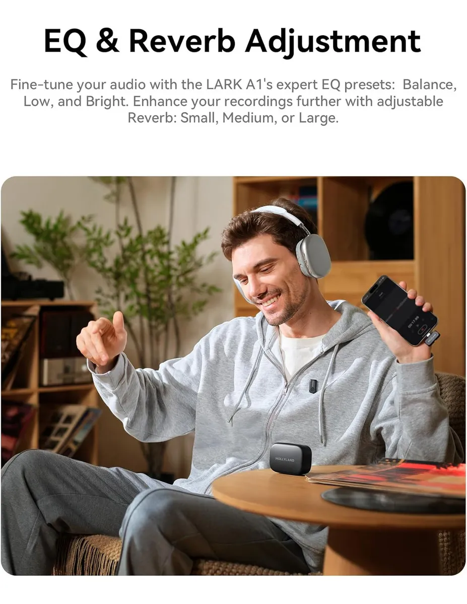 -Som personalizável com equalizador e reverberação: ajuste o áudio com precisão com as 3 predefinições de equalização do microfone sem fio LARK A1 (Balance/Low/Bright) e os 3 modos de reverberação (Pequeno/Médio/Grande). Esculpa com clareza, profundidade e textura: ideal para podcasters, criadores de ASMR e cineastas usando um mini microfone com qualidade de estúdio.