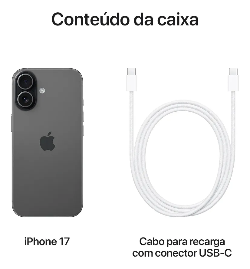 4. Testes conduzidos pela Apple em julho de 2025 usando unidades em pré-produção do iPhone 17, iPhone Air, iPhone 17 Pro e iPhone 17 Pro Max com software em versão preliminar, cabo para recarga com conector USB-C e adaptador dinâmico de 40W da Apple com potência máxima de 60W (modelo A3351) e carregadores MagSafe da Apple (modelo A3502 de 1 metro e modelo A3503 de 2 metros) com adaptador de energia USB-C de 30W da Apple (modelo A2164) ou adaptador dinâmico de 40W da Apple com potência máxima de 60W (modelo A3351). Os testes de recarga rápida foram conduzidos com unidades descarregadas de iPhone. O tempo foi calculado do momento em que o logo da Apple aparece até o aparelho iniciar. O tempo de recarga varia de acordo com a o adaptador, os ajustes, o uso e fatores ambientais. Os resultados reais podem variar.