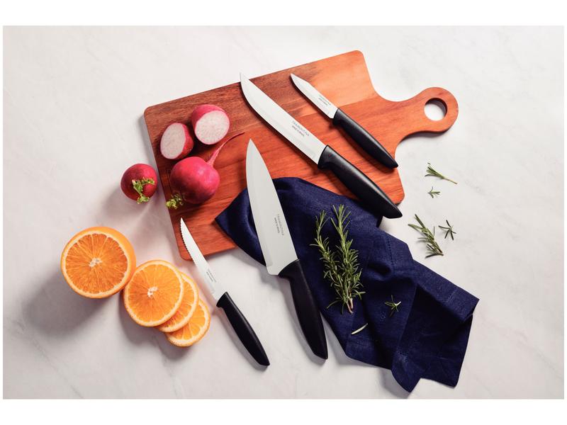 O jogo de facas 4 peças Tramontina Plenus será seu ajudante perfeito na hora de preparar suas refeições, sejam elas com carnes, legumes ou frutas. Perfeito para uso diário, ele é composto por facas desenvolvidas com lâminas em aço inox com tratamento térmico e devido a isso, garantem um excelente fio de corte. Os cabos são em polipropileno na cor preta, são resistentes e duráveis, podendo ainda, ir à máquina de lavar louças. É indicado para churrasco e preparo na cozinha na rotina do seu dia a dia, facilita sua vida, pois podem ir direto na máquina de lavar-louças. Composto por 1 Faca para legumes/frutas 3", 1 Faca serrilhada 5”, 1 Faca para cozinha 6" e 1 Faca Chef 7".