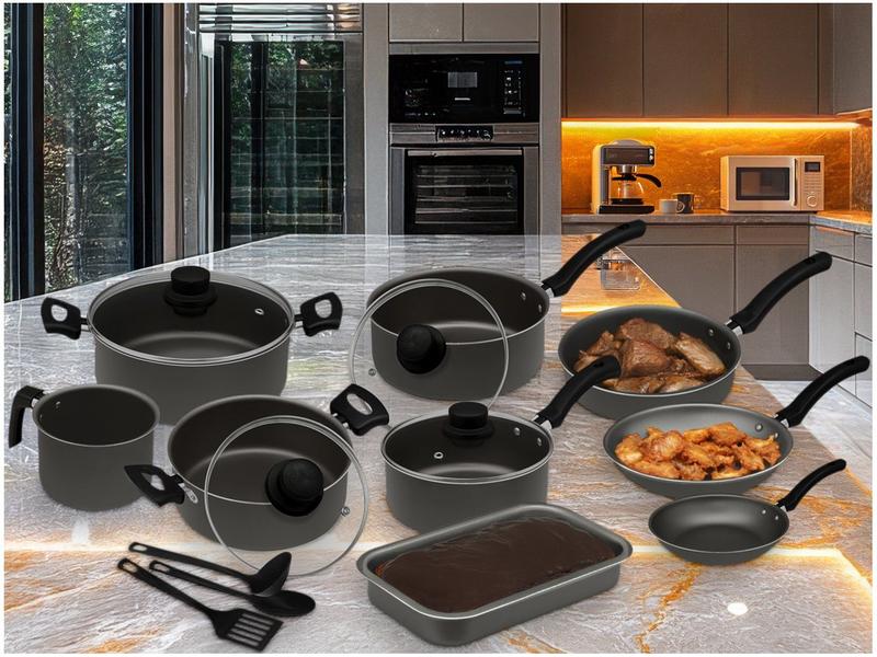 Descubra o Jogo de Panelas Facility 12 Peças da Eirilar, criado para elevar sua experiência culinária com praticidade e design moderno. Com acabamento premium em grafite e fabricado em alumínio, esse conjunto oferece excelente condução de calor, garantindo que seus pratos sejam cozidos de maneira uniforme. Revestido com um sofisticado sistema de antiaderente, as peças são fáceis de limpar e extremamente duráveis, ideais para fogões a gás.
