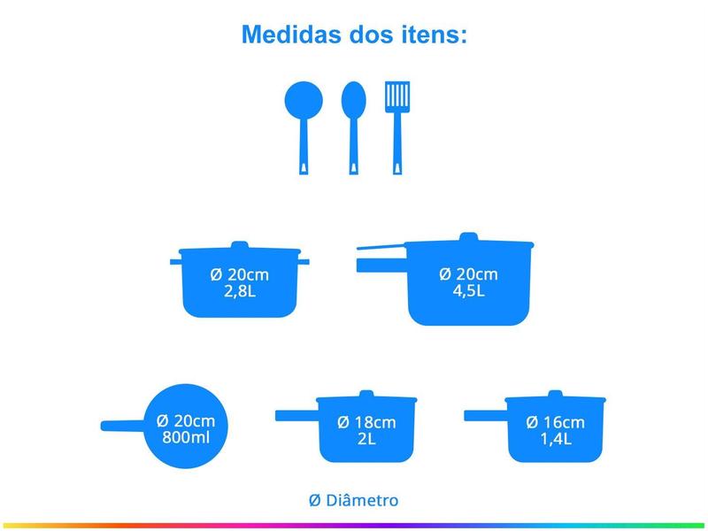 Os cabos e alças são em baquelite antitérmico, garantindo segurança no manuseio, enquanto as tampas de vidro temperado com saída de vapor facilitam o acompanhamento das receitas. Além disso, acompanha utensílios de nylon resistentes até 180 °C, que não riscam o antiaderente.