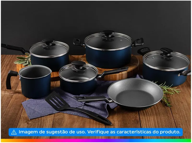 - 1 Caçarola 2,8L; 1 Caçarola 3,7L; 1 Panela 1,4L; 1 Panela 2,0L; 1 Fervedor 1,0L e1 Frigideira 1,1L.