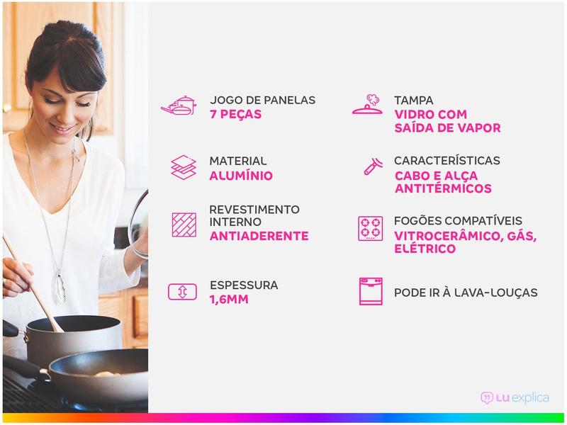- 1 Caçarola 20cm; 1 Caçarola 22cm; 1 Panela 16cm; 1 Panela 18cm; 1 Fervedor 12cm e 1 Frigideira 22cm.