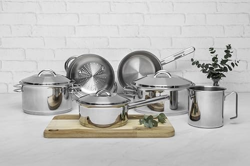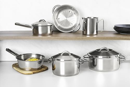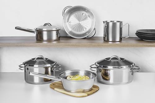 - 01 Caçarola funda Ø 20cm 3,60l Solar / 01 Caçarola rasa Ø 24cm 4,7l Solar / 01 Cozi-vapore Ø 20cm 3,2l Solar / 01 Fervedor Ø 12cm 1,40l Allegra / 01 Frigideira sem tampa Ø 20cm 2,20l Allegra / 01 Panela Ø 16cm 1,4l Solar