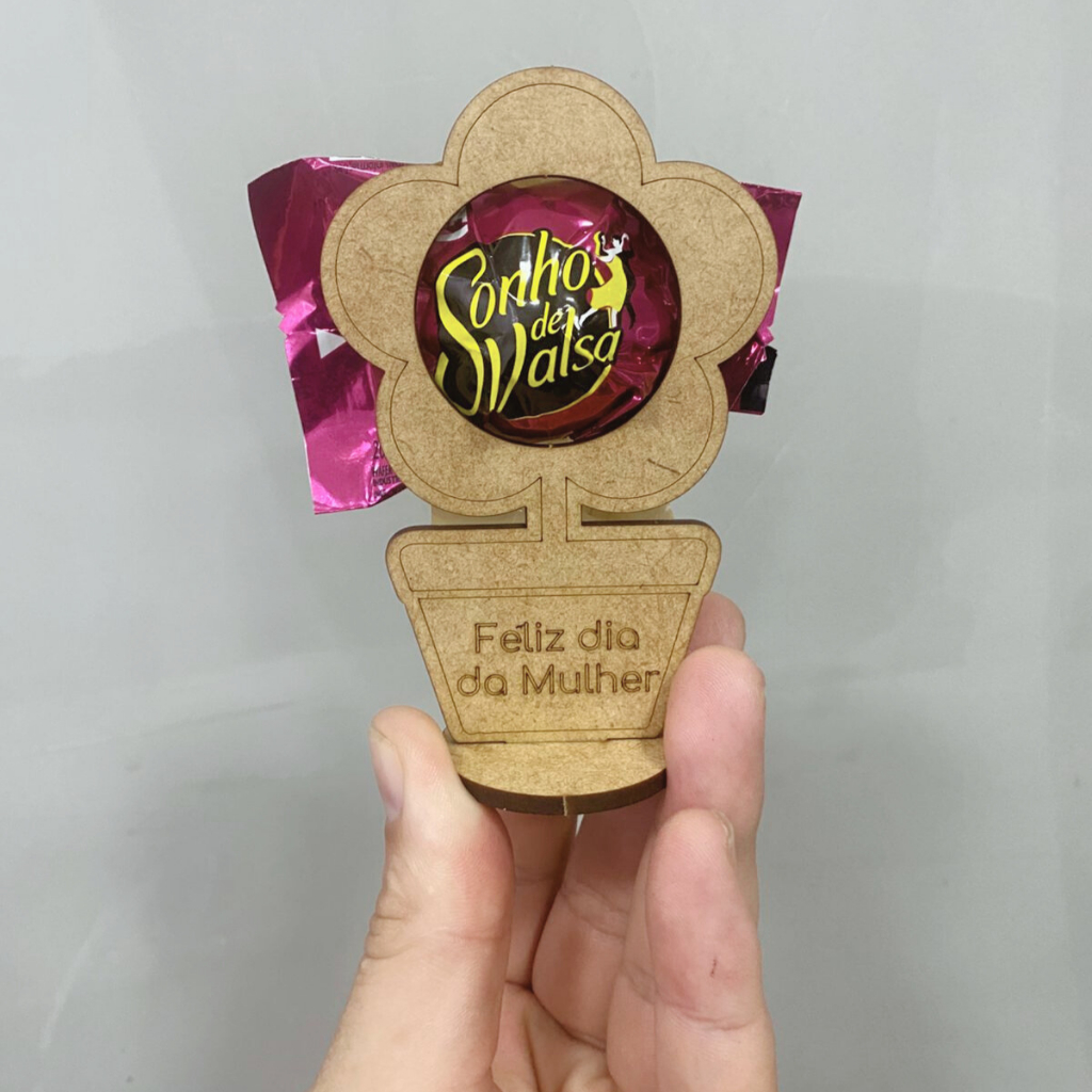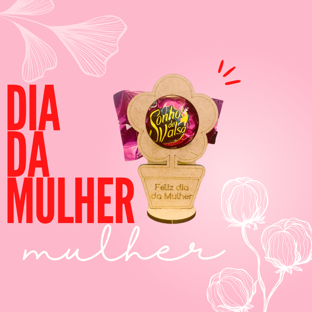 O centro da flor abriga um delicioso bombom, envolto com um toque de sofisticação. A base, que é um vasinho de MDF, traz a mensagem "Feliz Dia da Mulher" gravada com elegância, adicionando um toque personalizado e especial ao presente.