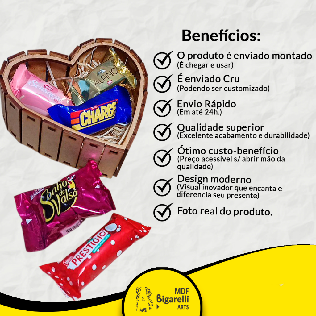Confeccionado em MDF CRU de qualidade, possui tampa com palavras e desenhos vazados, recortados à laser dando um requinte a mais na embalagem.